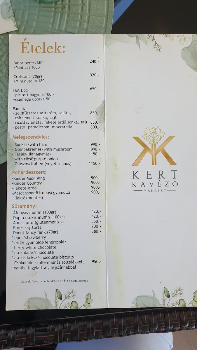 Welcome to Kert Kávézó, a charming café nestled in the serene surroundings of Pápa’s Várkert utca. It's a perfect spot to pause and enjoy life’s simple pleasures. The menu features a delightful selection of sweet treats, aromatic coffee, and tasty snacks that cater to both casual diners and families alike.